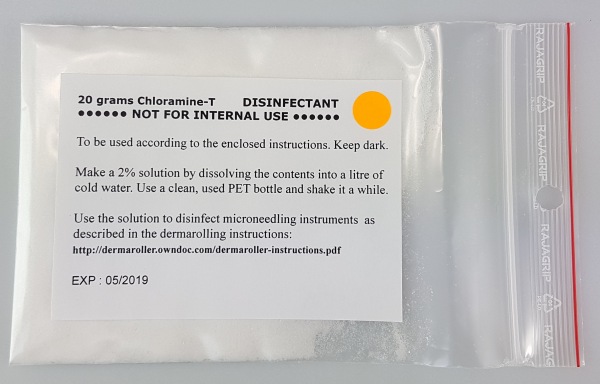 20 grams of Chloramine-T to make 1 to 4 litres (more than 1 gallon) of disinfecting solution for dermarollers, dermastamps and needles.