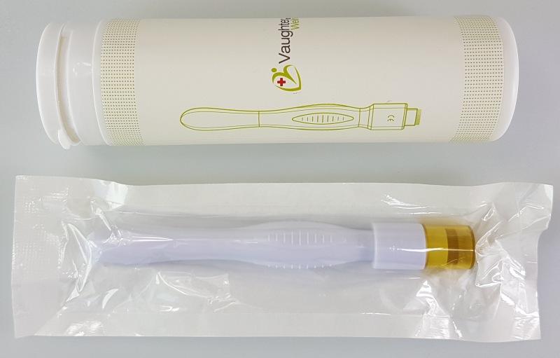 Dermastamp with 35 needles with a length of 1.5 mm and a base thickness of 0.25 mm. (The area with needles is about the size of a dime.) The needles are made of surgical steel. Gamma-sterilized.