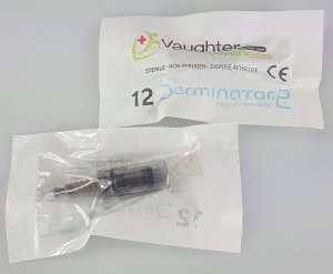 Derminator® 2 digital dermaneedling cartridge (12 needles). Needle diameter 0.15 mm. (38 SWG, 34½ AWG). Ethylene Oxide-sterilized. The needles are made of surgical steel and do not contain nickel. The cartride will remain sterile until the packaging gets an opening. 100 years sterility is possible when that does not happen.