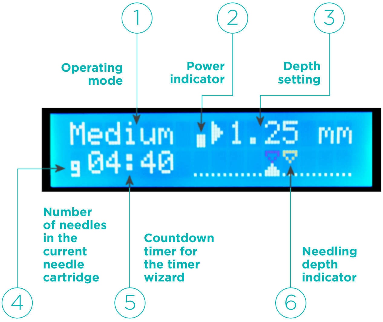 • Timer wizard which calculates, based on the skin area that you specify and the current needling speed, how long you should needle to achieve optimum prick density. The device counts down and turns itself off when that time has passed.