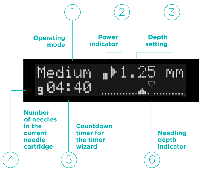 Digitally set needling depth. Very convenient! Changing needling depth is done by pushing a button on the console, not swapping adapter rings or twisting something on the hand unit. No need to interrupt treatment to adjust needling depth.